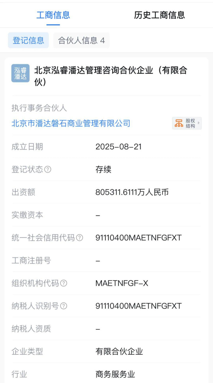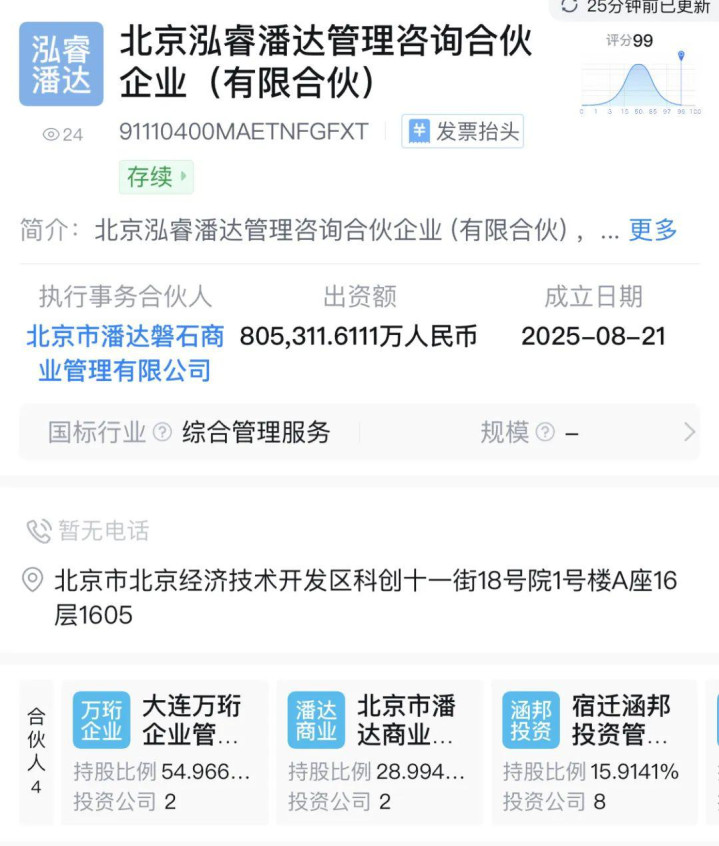 工商资料显示,近日,万达、京东旗下公司在北京投资设立北京泓睿潘达管理咨询合伙企业,该企业出资额约80.53亿元,经营范围包括企业管理咨询及信息技术咨询等相关业务。