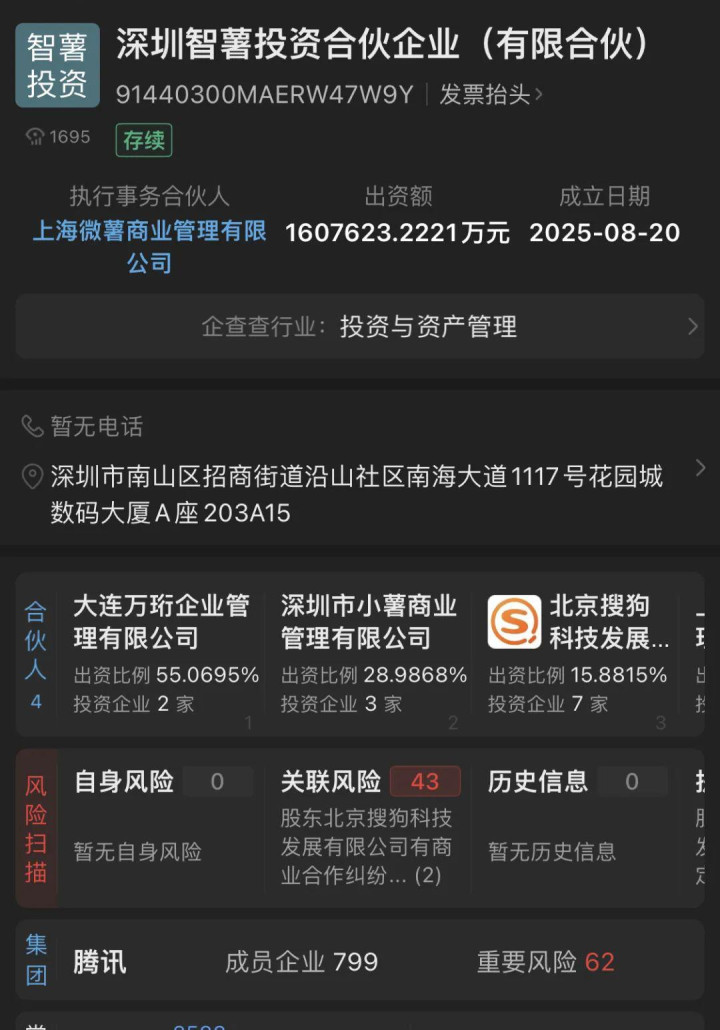 工商资料显示配资实盘正规平台,近日,万达、腾讯旗下公司在深圳投资设立深圳智薯投资合伙企业,该企业出资额约160.76亿元,经营范围包括以自有资金从事投资活动以及企业管理。其中,大连万达商管间接持股比例约55%,腾讯间接持股约45%。