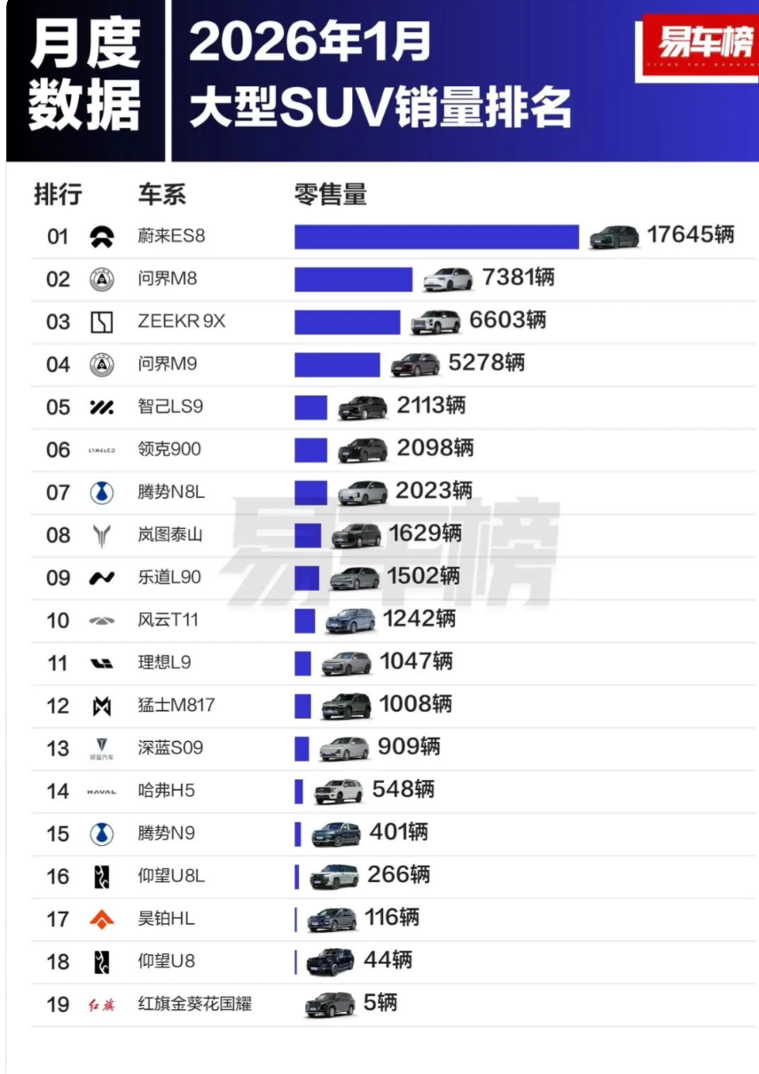 2026 年 1 月大型 SUV 零售销量榜正式公布,乘联分会数据显示,这一细分市场呈现出断层式的头部格局,蔚来全新 ES8 以 17645 辆的成绩强势登顶,不仅连续两个月拿下该细分市场销量冠军,更以远超第二名一倍多的销量,形成一家独大的市场态势,而曾经的热门车型理想 L9 则意外跌出前十,新势力品牌在榜单中占据绝对主导地位,传统品牌则表现低迷。