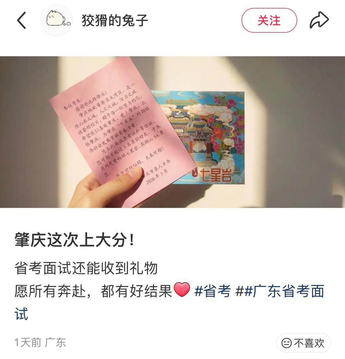 一张手绘明信片,承载着一座城市的细腻心意。有考生留言:“打开明信片那一刻,突然对肇庆有了家的感觉。”评论区里,“肇庆挺贴心的”“上大分!”等点赞不断刷屏。这份“贴心”,正是肇庆爱才惜才、以情留才的生动印证。
